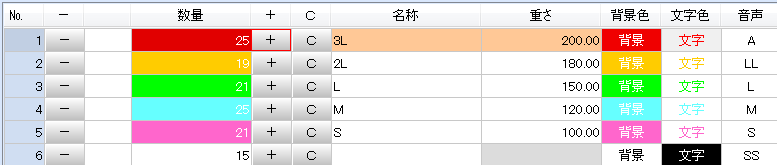 仕分けする際の仕分け数、各仕分け重量、各仕分け表示色、各仕分け音声をパラメータとして登録することで、各種(果物や野菜など)パターンを簡単にセットして即仕分け作業を開始することができます。